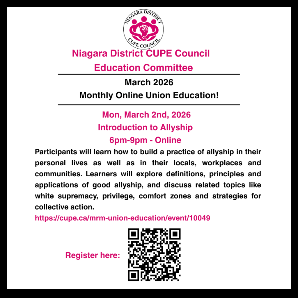 The Niagara District CUPE Council is dedicated to uniting and empowering CUPE locals across the Niagara Region through solidarity, advocacy, and collective action. We support our affiliated locals by fostering collaboration, sharing resources, providing a platform for mutual support, and amplifying their voices on regional and provincial issues.